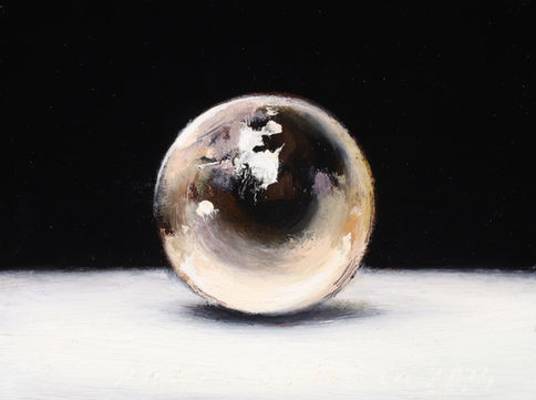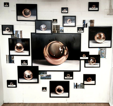 The paintings of the Reflections on Black series are painted in oil on metal. As models I use objects I made from reflective materials. Working on compositions of multi-layered, distorted reflections in space, I study the similarities between hyperrealistic and abstract painting.